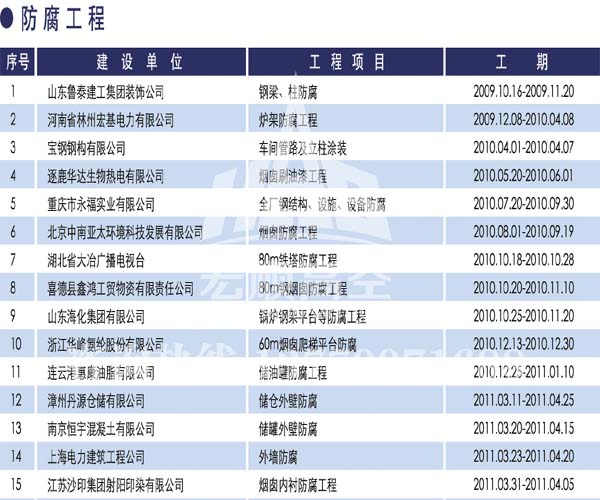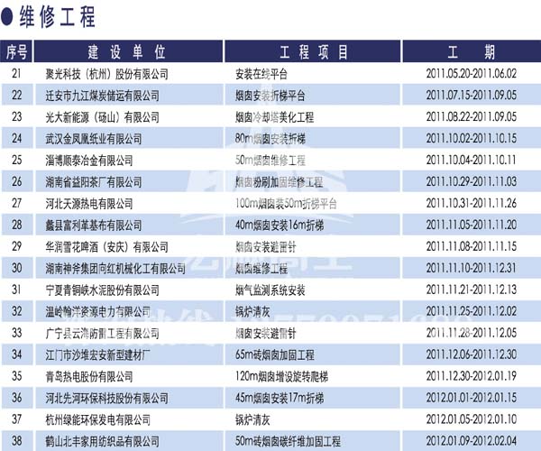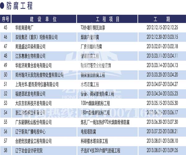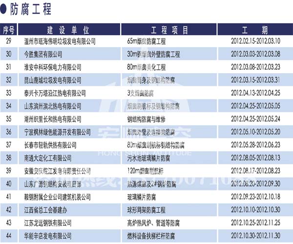 宏順建設(shè)工程有限公司是國(guó)家批準(zhǔn)成立的專(zhuān)業(yè)高空作業(yè)企業(yè):承攬過(guò)(國(guó)內(nèi).國(guó)外)煙囪新建、煙囪防腐、吊機(jī)防腐、水塔防腐、管道防腐、龍門(mén)吊防腐、儲(chǔ)存罐防腐、煙囪內(nèi)壁防腐等高空作業(yè)工程。具有“不搭腳手架 、 不需要停產(chǎn)”施工特點(diǎn)。